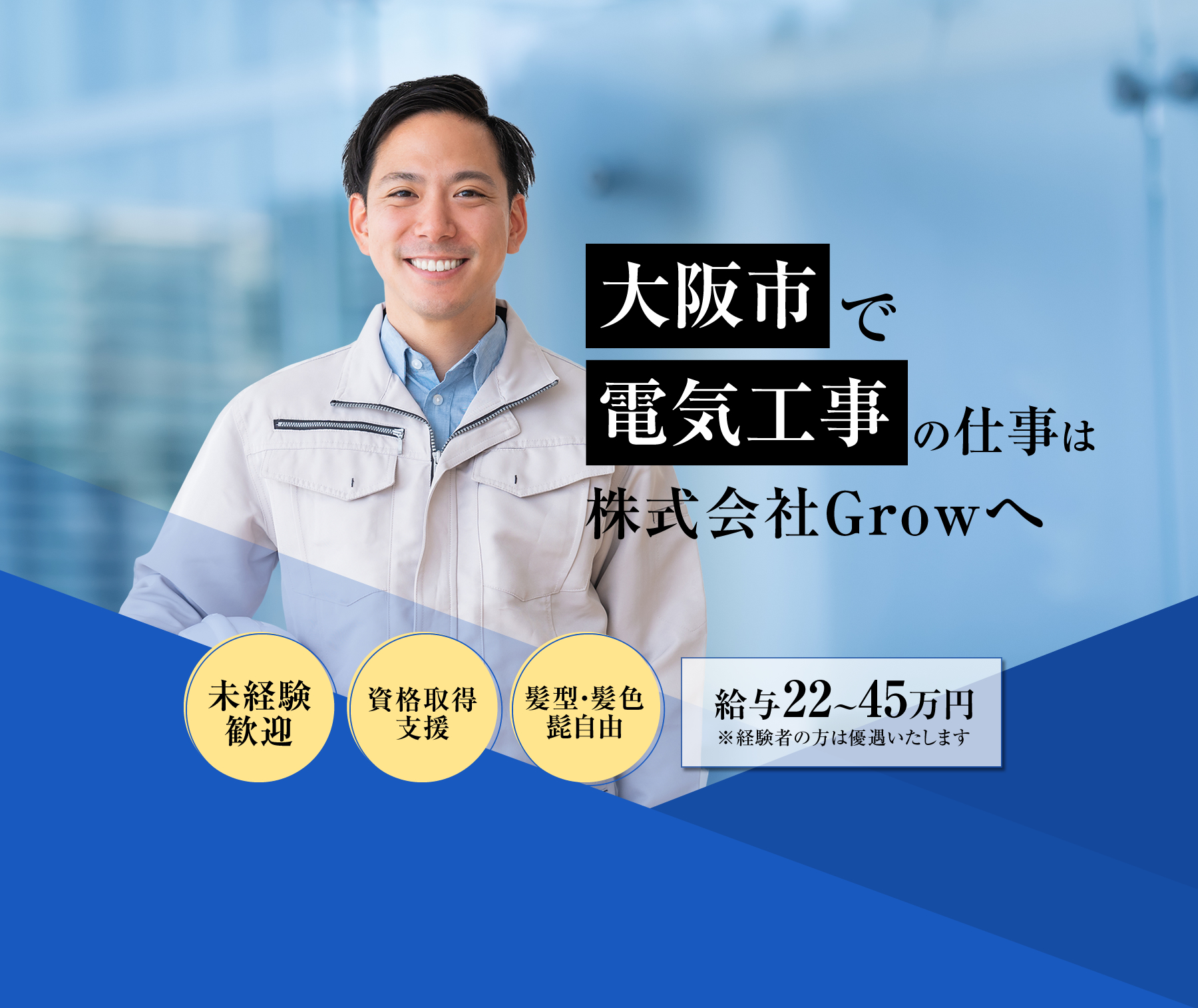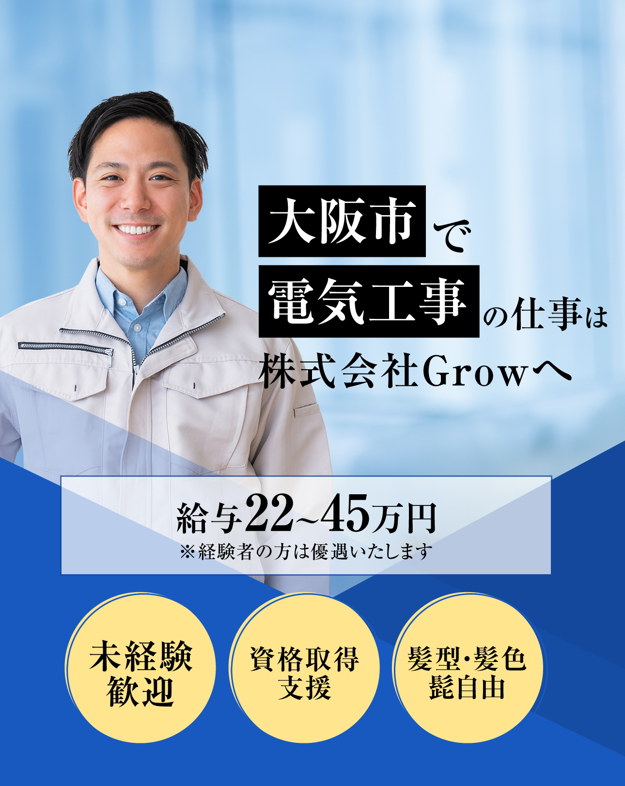 株式会社Growは、大阪府を中心に、携帯電話の基地局工事・空調工事・オール電化・太陽光工事などを主に行っています。今回、さらなる事業拡大にともない、新たな仲間を募集します。 経験の有無や年齢を問わず広く募集しているため、地元地域で働きたい方や現場仕事にご興味がある方は、お気軽にご応募ください。教育体制も整っており、一から丁寧に指導を行います。 前向きで真面目に取り組んでくださる方のご応募お待ちしております。